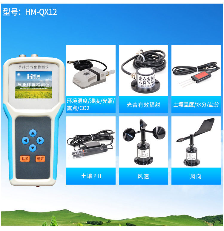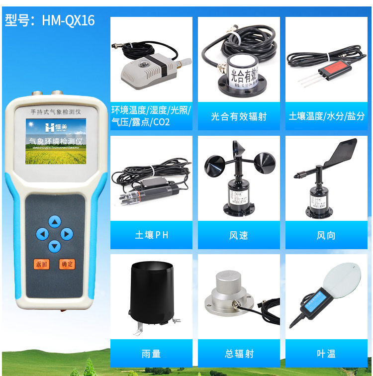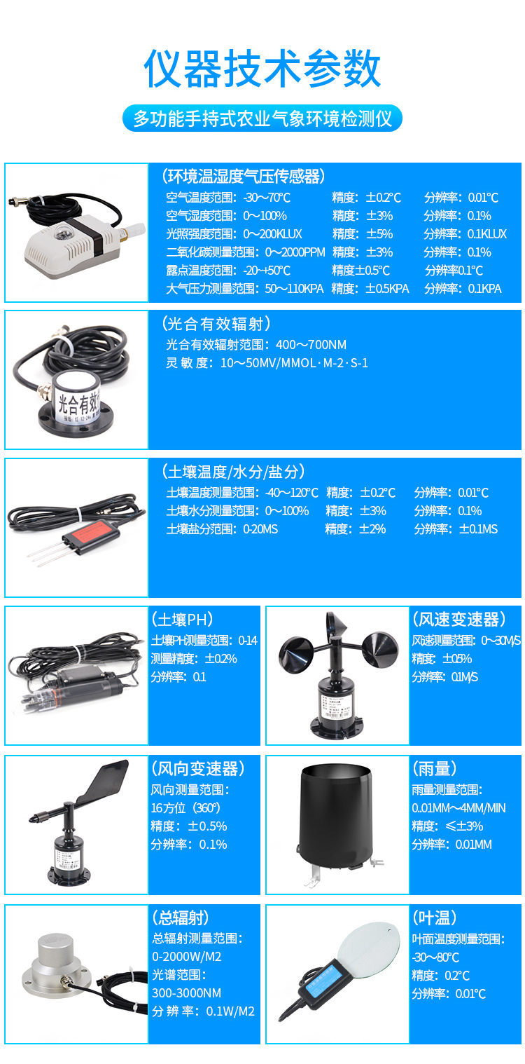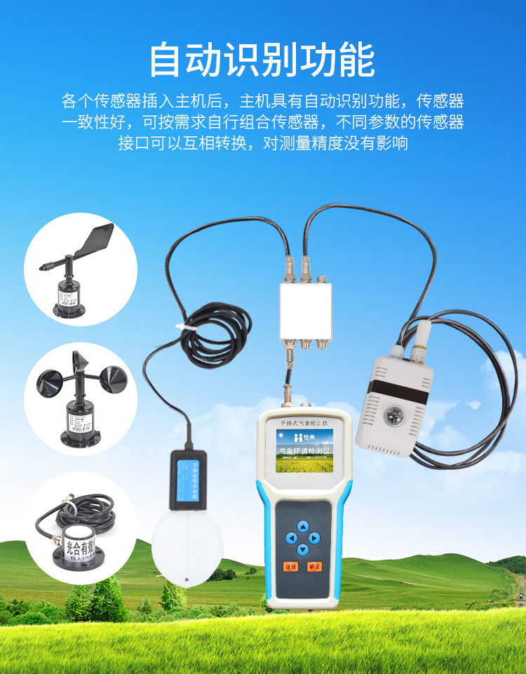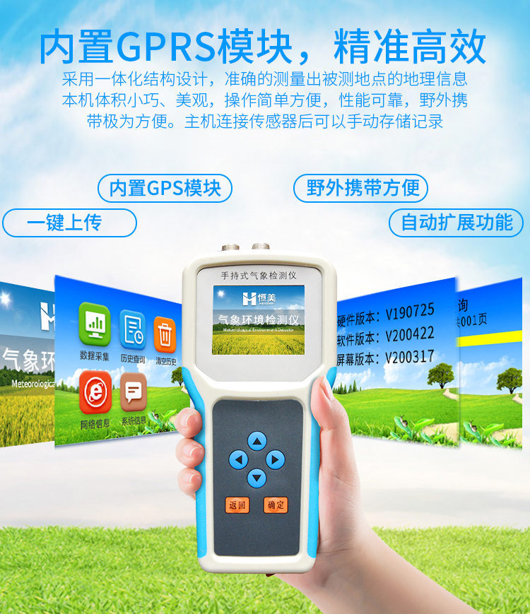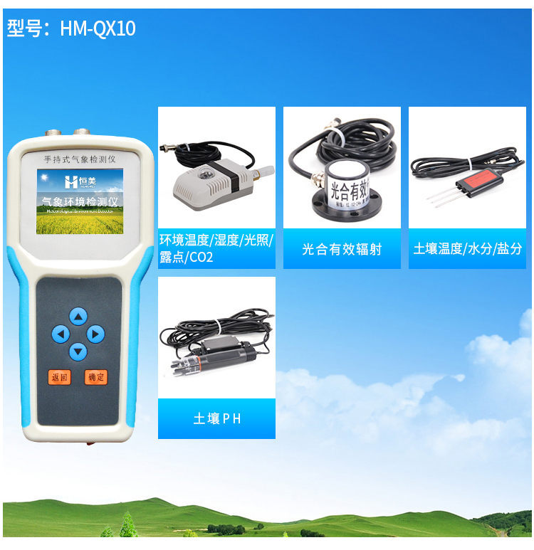 手持式智能農業(yè)氣象環(huán)境檢測儀是我們專門針對農田、草場局部小尺度環(huán)境設計的,對與植被和農作物生長密切相關的土壤、水氣等環(huán)境參數(shù)監(jiān)測的農田小氣候站。它主要觀測與農業(yè)相關的空氣溫度、空氣濕度、光照強度、二氧化碳濃度、露點溫度、光合有效輻射、土壤溫度、土壤濕度、土壤鹽分、土壤PH等10個環(huán)境參數(shù)氣象要素,為農業(yè)科研、農業(yè)生產等提供良好的支持。